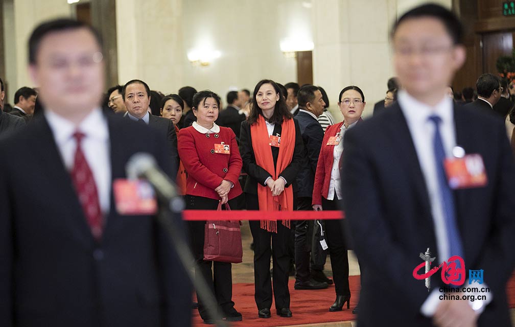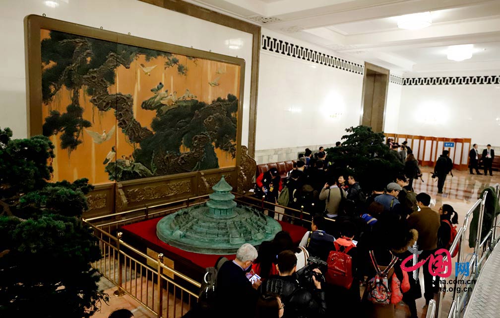 3月11日,人大常委会法工委“宪法修正案”记者会在人民大会堂一楼新闻发布厅举行,记者提前排队入场。中国网 杨佳摄影