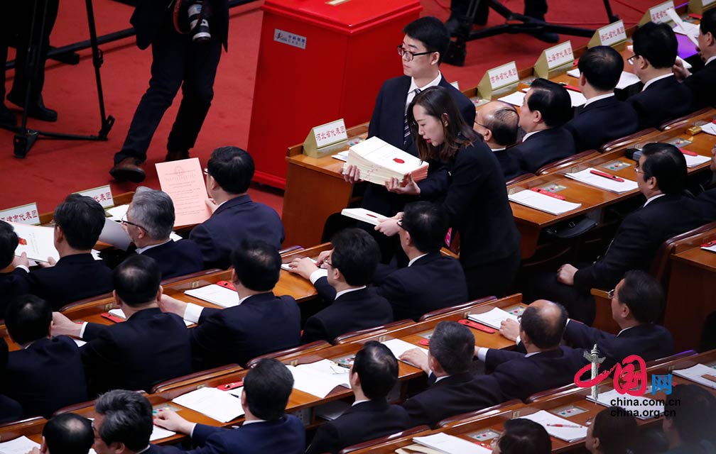 3月11日,十三届全国人大一次会议举行第三次全体会议,表决中华人民共和国宪法修正案草案。工作人员正在发票。中国网 杨佳摄影