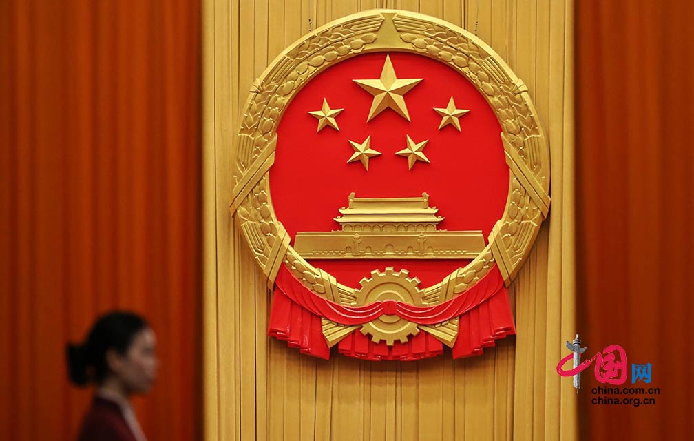 3月11日,十三届全国人大一次会议举行第三次全体会议,人民大会堂里庄严的国徽。中国网 郑亮摄影