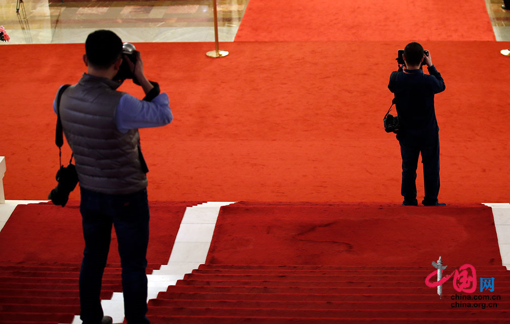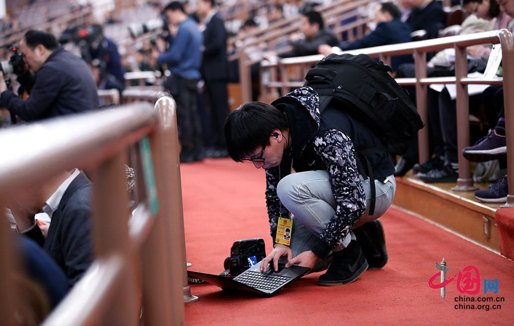 3月13日,记者在人民大会堂现场,回传国务院机构改革相关材料,保证所在媒体第一时间报道。中国网 杨佳摄影