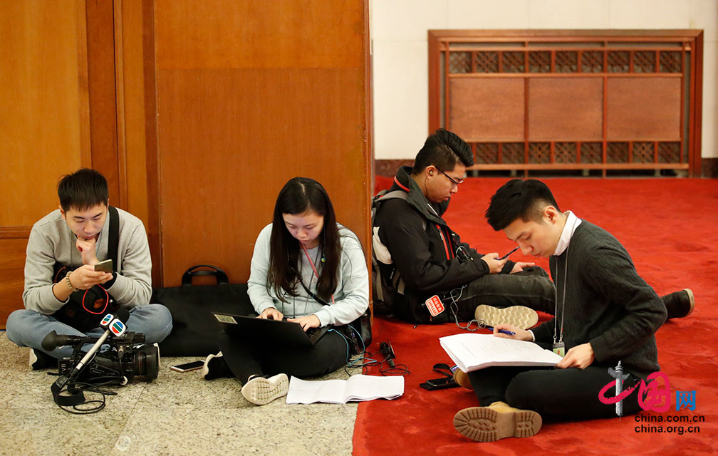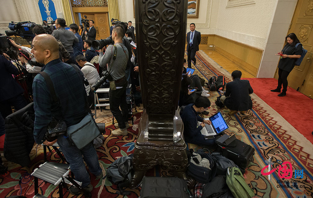 3月13日,新疆团团组开放日,与会媒体屏风前采访,屏风后发稿。中国网 郑亮摄影