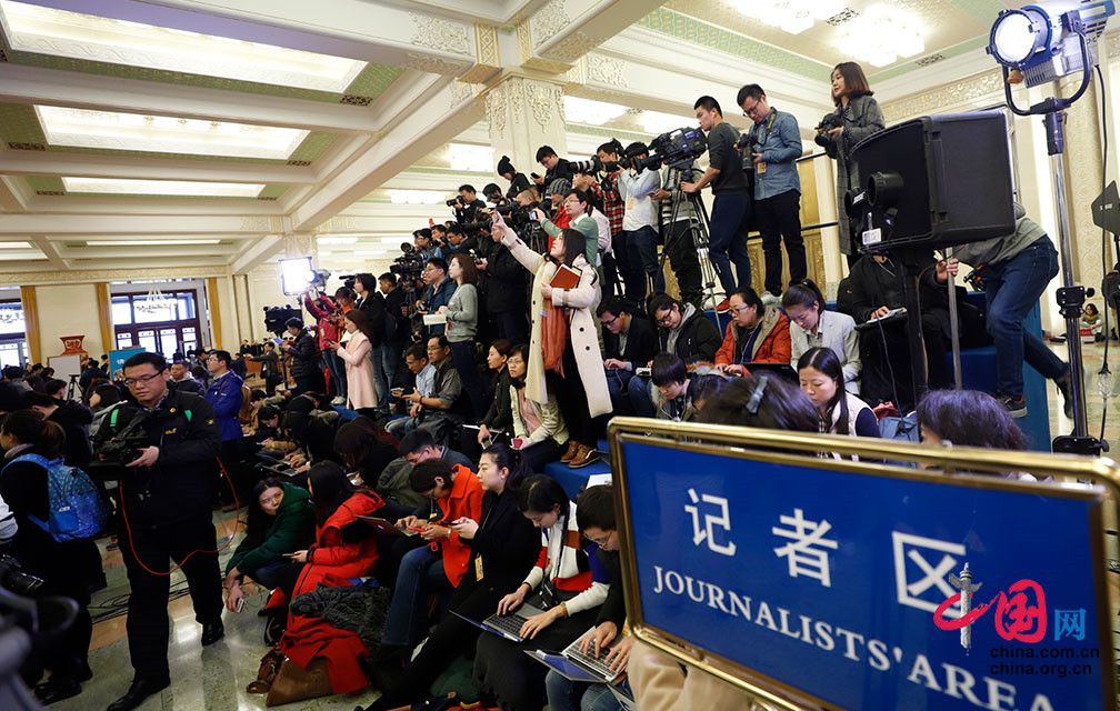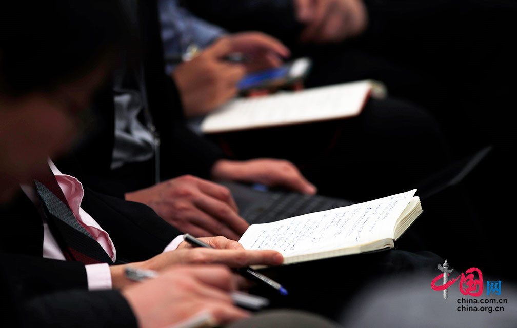 3月4日,在十三届全国人大一次会议首场新闻发布会上,与会媒体在记录发言人对热点问题的回应。中国网 杨佳摄影