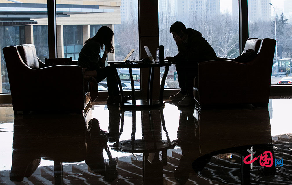 3月7日,报道全国“两会”的记者在代表驻地现场发稿。中国网董宁摄影