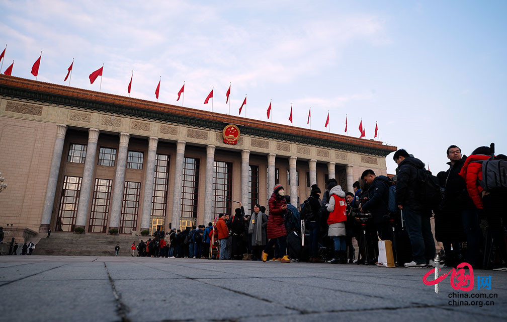 3月5日,十三届全国人大一次会议开幕前,记者凌晨6点就到人民大会堂前排队等候入场。中国网 杨佳摄影