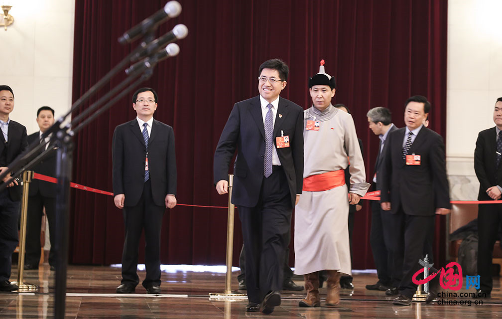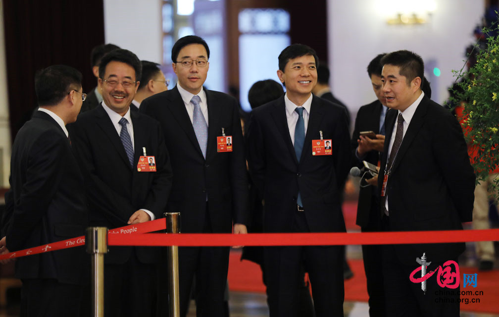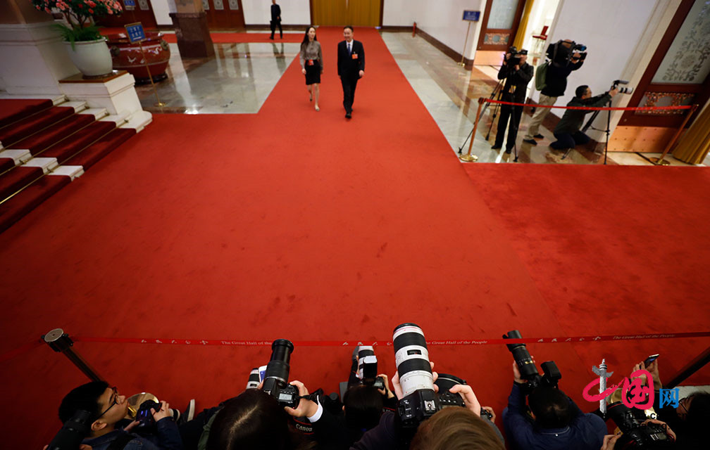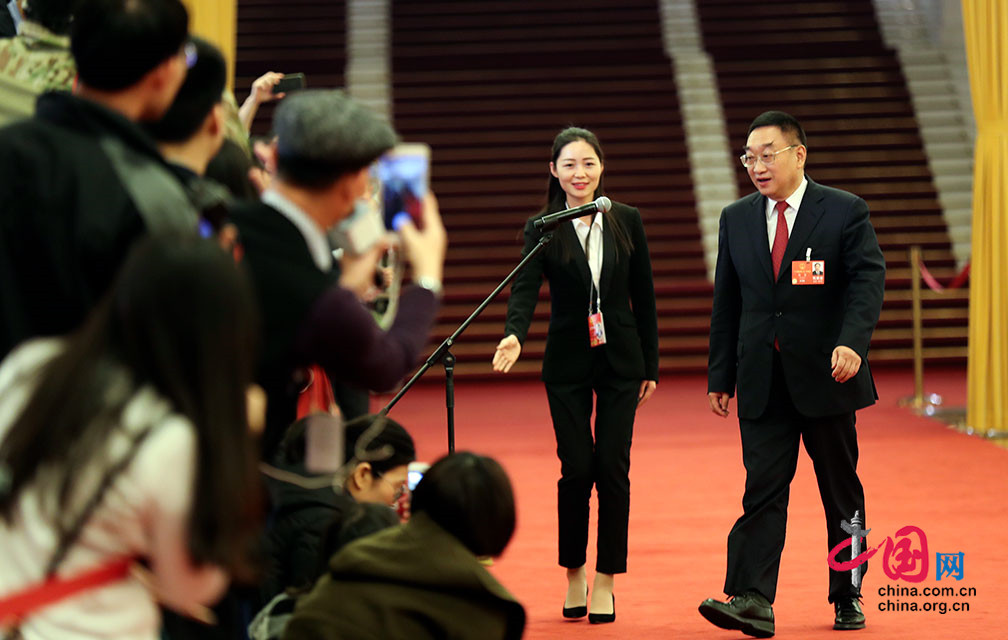 3月13日,参加第四次“代表通道”集体采访的全国人大代表意气风发的走向采访区。中国网 郑亮摄影