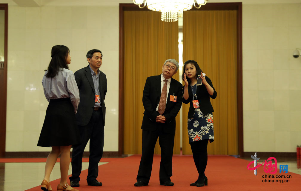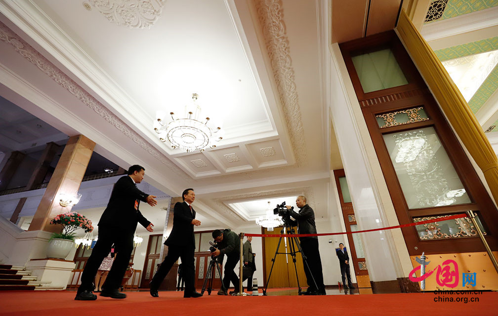 3月15日,等待接受集体采访的全国政协委员在“委员通道”入口处候场。中国网 董宁摄影