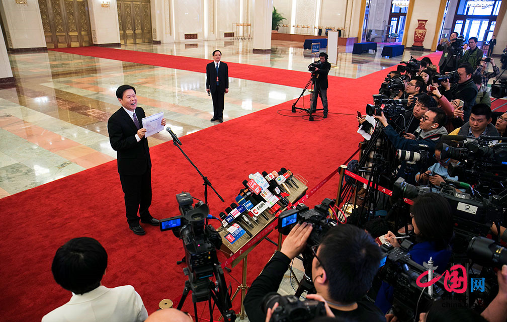 3月13日,国税总局局长王军在“部长通道”回答记者提问。中国网 董宁摄影