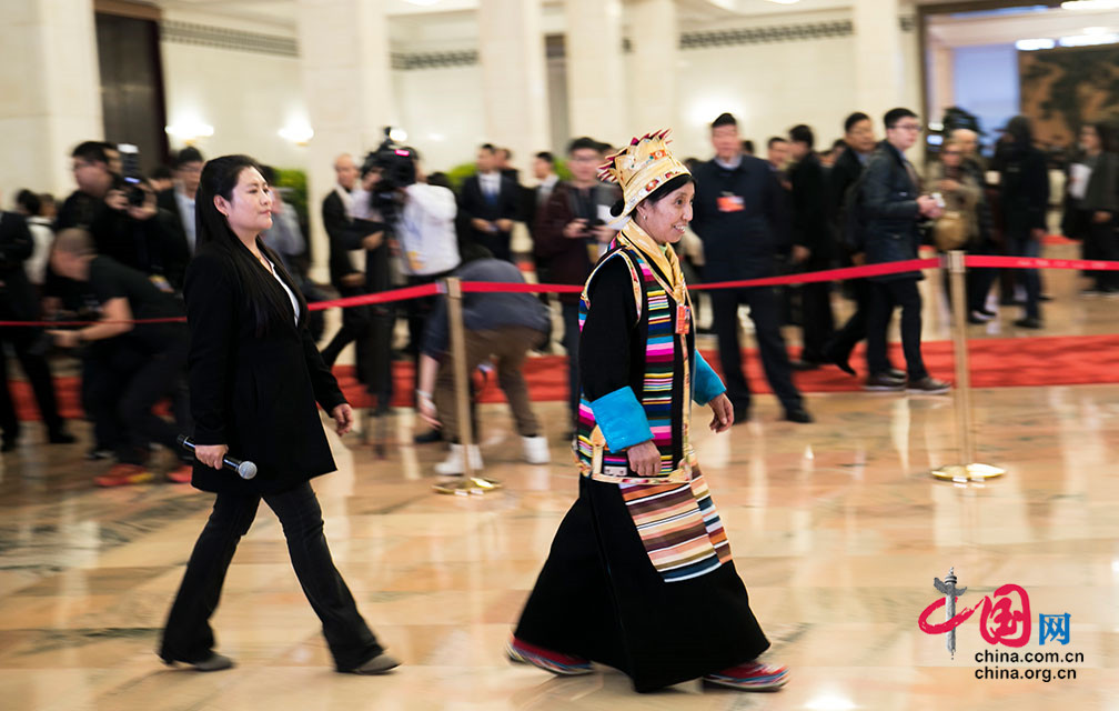 3月11日,来自西藏自治区隆子县玉麦乡玉麦村的全国人大代表卓嘎走上“代表通道”接受记者采访。中国网 董宁摄影